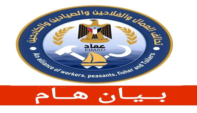 اصدر.تحالف العمال والفلاحين والصيادين والكادحين ( عماد ) بمحافظه حضرموت بيانا أعلن فيه رفض المشاركة في دعوات واجتماع يوم السبت بهضبه حضرموت:
