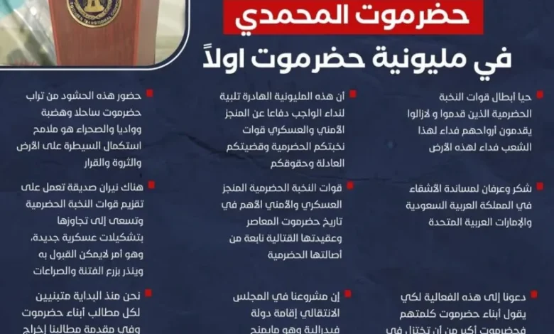 حيا أبطال قوات النخبة الحضرمية الذين قدموا و لازالوا يقدمون أرواحهم فداء لهذا الشعب فداء لهذه الأرض. – ⁠أن هذه المليونية الهادرة تلبية لنداء الواجب دفاعا عن المنجز الأمني والعسكري قوات نخبتكم الحضرمية وقضيتكم العادلة وحقوقكم. – ⁠حضور هذه الحشود من تراب حضرموت ساحلا وهضبة وواديا والصحراء هو ملامح استكمال السيطرة على الأرض والثروة والقرار. – ⁠شكر وعرفان لمساندة الأشقاء في المملكة العربية السعودية والإمارات العربية المتحدة. – ⁠قوات النخبة الحضرمية المنجز العسكري والأمني الأهم في تاريخ حضرموت المعاصر وعقيدتها القتالية نابعة من أصالتها الحضرمية. – ⁠هناك نيران صديقة تعمل على تقزيم قوات النخبة الحضرمية وتسعى إلى تجاوزها بتشكيلات عسكرية جديدة، وهو أمر لايمكن القبول به وينذر بزرع الفتنة والصراعات، ويلغم الحياة السياسية والاجتماعية. – ⁠دعونا إلى هذه الفعالية لكي يقول أبناء حضرموت كلمتهم فحضرموت أكبر من أن تختزل في شخص أو تحتكر تمثيلها قبيلة. – ⁠إن مشروعنا في المجلس الانتقالي إقامة دولة فيدرالية وهو مايمنح المحافظات الصلاحيات الكاملة لإدارة شؤونها. – ⁠نحن منذ البداية متبنيين لكل مطالب أبناء حضرموت وفي مقدمة مطالبنا إخراج قوات المنطقة العسكرية الأولى من مناطق الوادي واستبدالها بقوات النخبة. – ⁠إن المليونية اليوم لنجدد العهد والولاء لقوات النخبة الحضرمية ونعبر لها عن مدى اعتزازنا وتثميننا للتضحيات الجسيمة التي قدمها ضباطها وأفرادها. – ⁠نحذر من جر حضرموت مجددا إلى باب اليمن وإعادة التشكيلات الحزبية اليمنية وما جرى إشهاره مؤخرا تحت مسمي تيار التغيير والتحرير. – ⁠نحذر إخواننا في مختلف المكونات الحضرمية من التمادي والفجور في الخلافات الشخصية والتباينات لان المستفيد الوحيد من تصعيد الخلاف هم الناهبون لثروات حضرموت. – ⁠قوات النخبة الحضرمية خط أحمر، فهي درع حضرموت الذي لن نسمح للمساومة عليه.