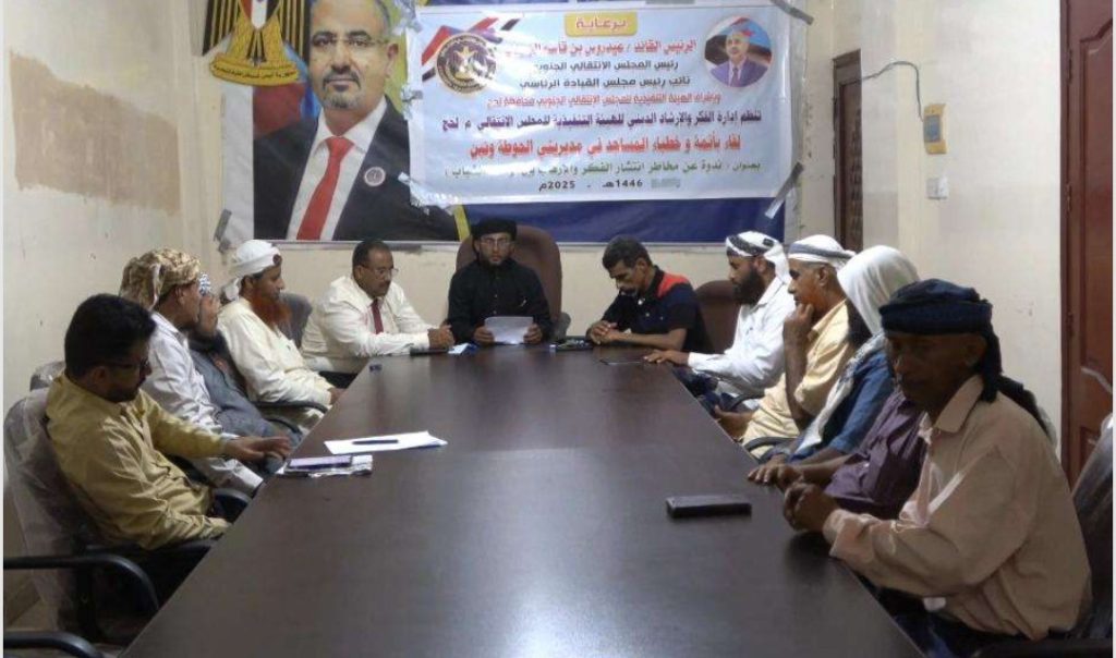 نظمت إدارة الفكر والإرشاد بالهيئة التنفيذية للقيادة المحلية للمجلس الانتقالي الجنوبي في محافظة لحج، اليوم الاثنين، لقاءً تشاوريًا مع أئمة وخطباء المساجد في مديريتي الحوطة وتبن، بعنوان “مخاطر انتشار الفكر الإرهابي بين الشباب”.