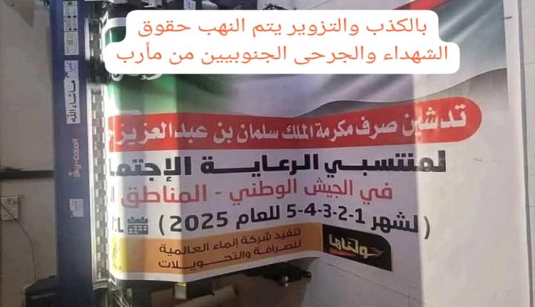 وجاء في بيان مكاتب الشهداء والجرحى بالمحافظات الجنوبية أن أي مكرمة سعودية لم تصل إلى هذه المحافظات منذ سنوات، رغم الإعلان المتكرر عن صرفها عبر لجان تتبع قيادة هيئة الأركان في مأرب. وتشير المعلومات التي وصلت إلى تلك مكاتب إلى وجود ختم رسمي لكل محافظة جنوبية داخل مأرب، يتم من خلاله رفع طلبات دعم إلى الأشقاء في المملكة العربية السعودية باسم المحافظات الجنوبية دون أن يُصرف لها أي شيء يُذكر.