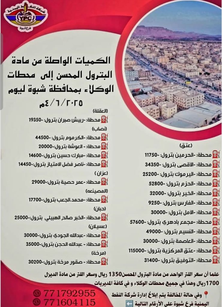 أعلنت شركة النفط اليمنية – فرع محافظة شبوة، اليوم، عن وصول كميات جديدة من مادتي البترول والديزل إلى محطات وكلائها المنتشرة في جميع مديريات المحافظة، في إطار جهودها لضمان الاستقرار التمويني وتلبية احتياجات المواطنين من المشتقات النفطية.