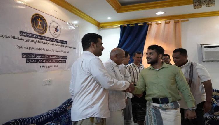 أقامت نقابة الصحفيين والإعلاميين الجنوبيين بحضرموت، اليوم الجمعة بمدينة المكلا، لقاءها الأول للصحفيين والإعلاميين الجنوبيين بالمحافظة بمناسبة عيد الأضحى المبارك، وذلك برعاية كريمة من رئيس الهيئة التنفيذية للقيادة المحلية للمجلس الانتقالي الجنوبي بمحافظة حضرموت، العميد الركن سعيد أحمد المحمدي.