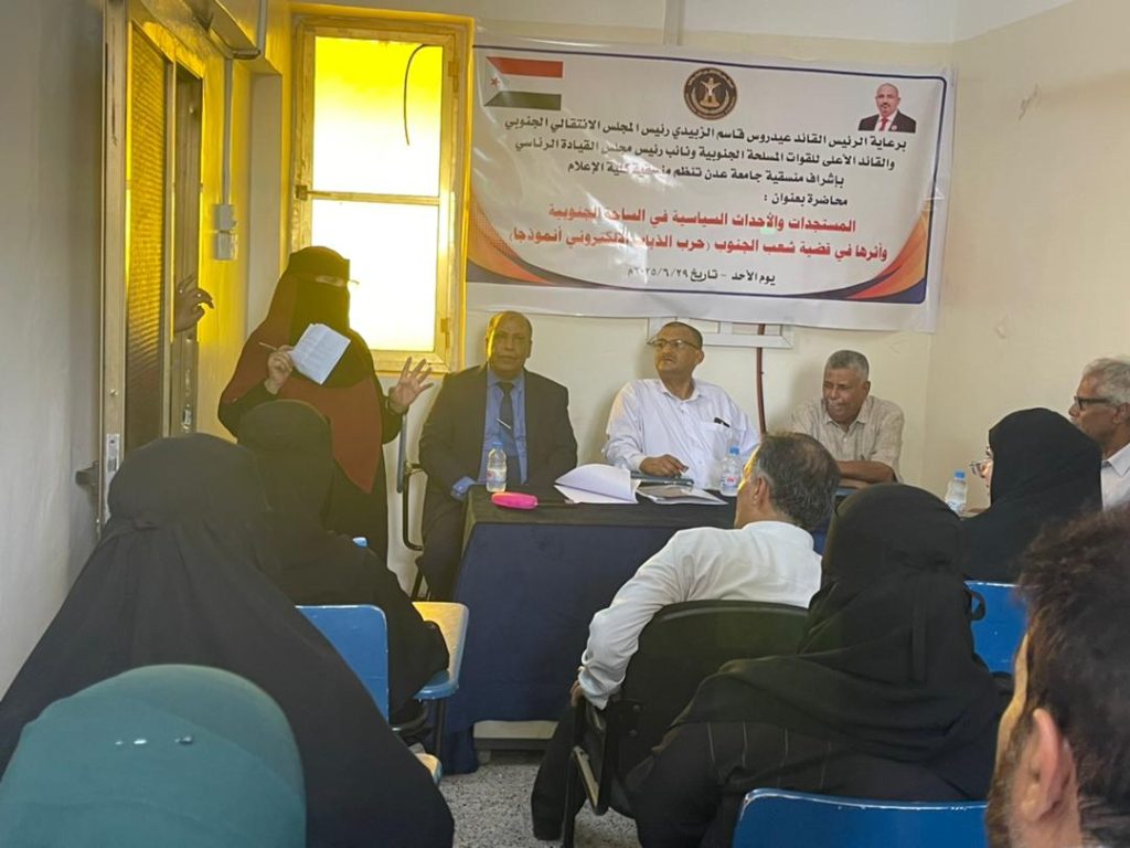 نظّمت منسقية كلية الإعلام بجامعة عدن، محاضرة سياسية توعوية تحت عنوان: “المستجدات والأحداث السياسية في الساحة الجنوبية وأثرها على قضية شعب الجنوب – حرب الذباب الإلكتروني أنموذجًا”، وذلك برعاية الرئيس القائد عيدروس قاسم الزبيدي، رئيس المجلس الانتقالي الجنوبي، القائد الأعلى للقوات المسلحة الجنوبية، نائب رئيس مجلس القيادة الرئاسي، وبإشراف مباشر من منسقية المجلس الانتقالي الجنوبي في جامعة عدن.