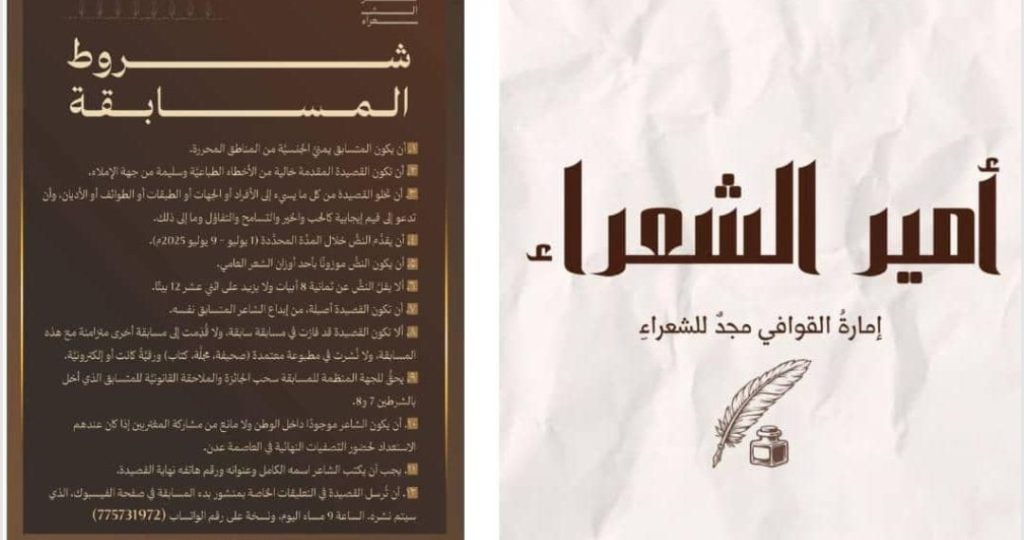 وأكدت اللجنة التي يشرف عليها الشاعر فهد بن جعموم، أن استقبال المشاركات سيكون عبر التعليقات على منشور الإعلان عبر صفحة “أمير الشعراء” أو من خلال رقم الواتساب 775731972، مشددة على أن أي مشاركة ترد بعد الموعد النهائي المحدد لن تُقبل.