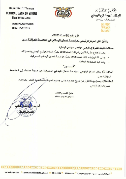 في خطوة جديدة تعزز من حضور المؤسسات السيادية في العاصمة المؤقتة عدن، أصدر محافظ البنك المركزي اليمني، أحمد أحمد غالب، قرارًا رسميًا برقم (6) لسنة 2025م يقضي بنقل المركز الرئيسي لمؤسسة ضمان الودائع المصرفية من العاصمة صنعاء إلى عدن. جاء القرار استنادًا إلى قانون البنك المركزي اليمني رقم (14) لعام 2000 وقانون مؤسسة ضمان الودائع المصرفية رقم (40) لسنة 2008، ويهدف إلى إعادة هيكلة عمل المؤسسة بما ينسجم مع المتغيرات الاقتصادية والإدارية الحالية. وبحسب القرار، فإن نقل المقر يسري من تاريخ صدوره ويشمل توجيه جميع الجهات المختصة بتنفيذه فورًا. هذه الخطوة تعد ضربة قوية لجماعة الحوثي التي كانت تسيطر على مفاصل القطاع المصرفي في صنعاء، كما تؤكد على إصرار الحكومة المعترف بها دوليًا على إعادة بناء المنظومة المالية من العاصمة المؤقتة عدن في إطار عملية استعادة الدولة والمؤسسات المالية الشرعية.