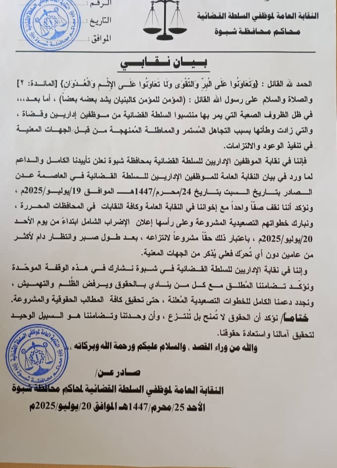 أصدرت النقابة العامة لموظفي السلطة القضائية في محافظة شبوة، بيانًا قويًا، يعكس التحديات الجسيمة التي يواجهها منتسبو السلطة القضائية، من موظفين إداريين وقضاة، في ظل الظروف الصعبة التي تعصف بهم،وشدد البيان، على أن معاناة الموظفين قد تفاقمت نتيجة التجاهل المستمر والمماطلة من الجهات المعنية في تنفيذ الوعود والالتزامات.وأعلنت النقابة، تأييدها الكامل لما ورد في بيان النقابة العامة للموظفين الإداريين للسلطة القضائية في العاصمة عدن، والذي دعا إلى إضراب شامل بدءًا من يوم الأحد 20 يوليو 2025م، كخطوة مشروعة لانتزاع الحقوق بعد عامين من الانتظار والصبر.وأكدت النقابة، أنها تقف صفاً واحداً مع إخوانها في النقابة العامة وكافة النقابات في المحافظات المحررة، مُباركةً خطواتهم التصعيدية، ومشيرةً إلى أن هذه الإجراءات تأتي كحق طبيعي للموظفين في المطالبة بحقوقهم المشروعة.وفي ختام البيان، دعت النقابة جميع منتسبي السلطة القضائية إلى المشاركة الفعالة في الإضراب، مجددةً التأكيد على أن الحقوق لا تمنح بل تنتزع، وأن الوحدة والتضامن هما السبيل الوحيد لتحقيق الأهداف المنشودة واستعادة الحقوق المسلوبة.