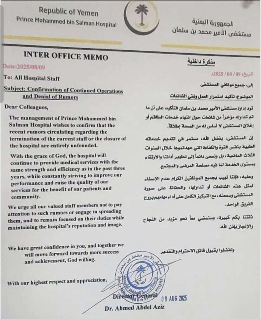أصدر مستشفى الأمير محمد بن سلمان، في العاصمة عدن، مذكرة داخلية موجهة إلى جميع موظفيه، يؤكد فيها استمرار عمله ونفى جميع الشائعات التي تداولتها بعض الأوساط خلال الفترة الماضية حول إغلاق المستشفى أو إنهاء خدمات العاملين فيه.