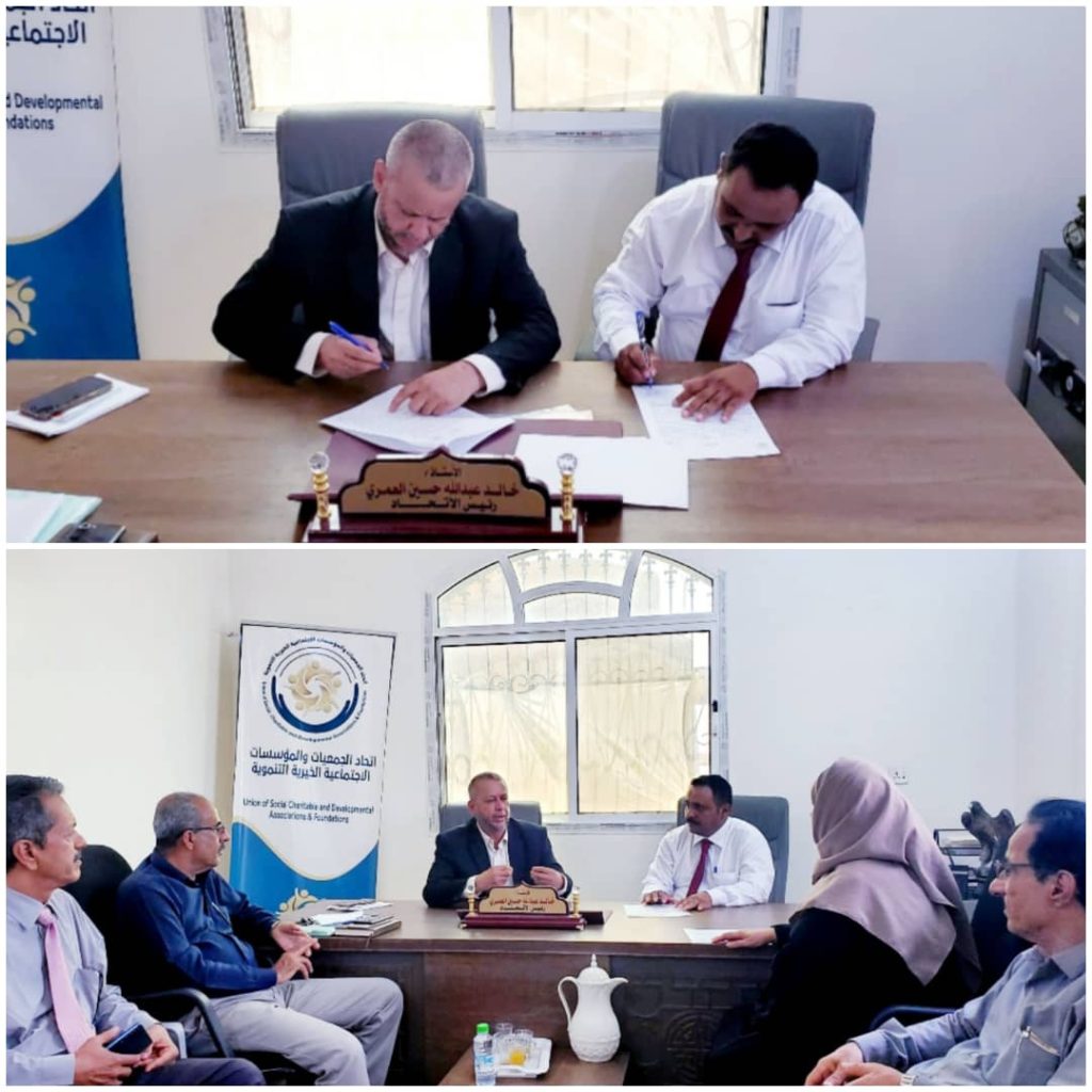 وقعت في العاصمة عدن، اليوم، مذكرة تفاهم بين اتحاد الجمعيات والمؤسسات الاجتماعية الخيرية التنموية، ومؤسسة سعيد باشافعي للمؤتمرات والمعارض الدولية، لتعزيز التعاون وتبادل الخبرات بينهما، بهدف تحقيق التنمية المستدامة في المجالات الاجتماعية والخيرية.