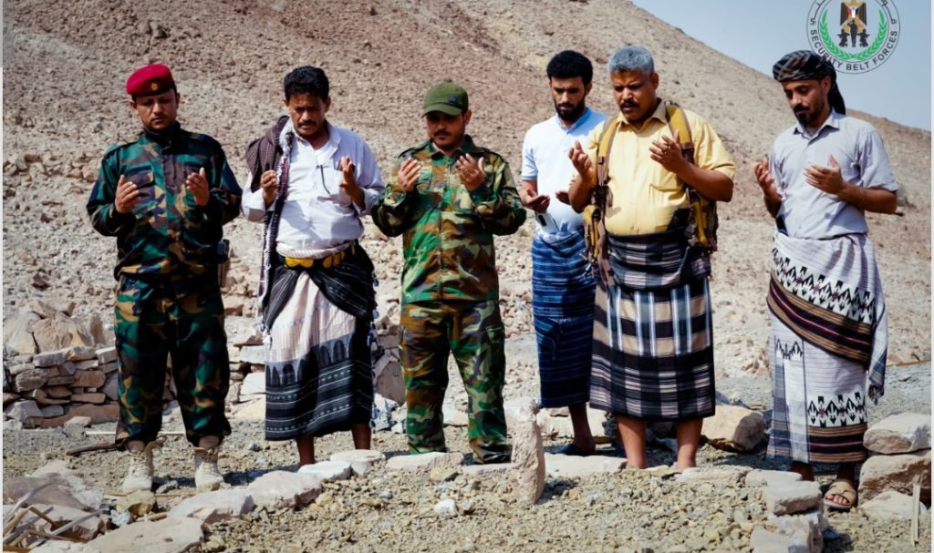 وضم الوفد الزائر كلاً من العميد صامد بعوة مدير الإدارة العامة للإمداد والتموين، ورشدي العمري مدير المركز الإعلامي، وإبراهيم سيود ركن التوجيه المعنوي لحزام أبين، إلى جانب عدد من الضباط، حيث قرأوا الفاتحة على روحه الطاهرة، مبتهلين إلى الله أن يتغمده بواسع رحمته ويسكنه فسيح جناته.