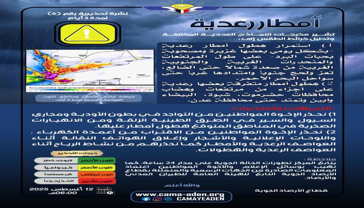 وتوقع المركز، بمشيئة الله تعالى، في نشرة تحذيرية لمدة 3 أيام صادرة عنه مساء اليوم الثلاثاء 12/8/2025، استمرار هطول أمطار رعدية – بشكل يومي بعضها غزيرة ومصحوبة بحبات البرد – على طول المرتفعات والمنحدرات الغربية والجنوبية الغربية، من صعدة شمالاً حتى الضالع وتعز ولحج جنوباً، وامتدادها غرباً حتى سواحل البحر الأحمر.