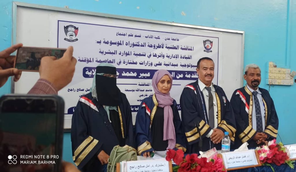 وبعد المناقشة، أقرت اللجنة منح الباحثة عبير محمد حسين علاية، درجة الدكتوراه بامتياز من قسم علم الاجتماع – كلية الآداب، جامعة عدن.