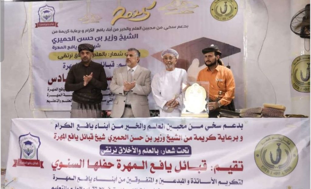 شارك فريق التوجيه والرقابة الرئاسية، برئاسة عبدالناصر الجعري، اليوم الأحد، في الحفل السنوي لتكريم الطلاب المتفوقين من أبناء يافع بمحافظة المهرة، والذي أقيم برعاية شيخ قبائل يافع بالمهرة، وزير بن حسن الحميري.