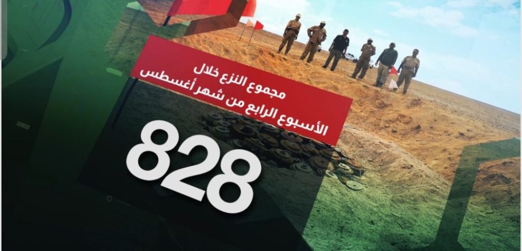 أعلنت غرفة عمليات مشروع مسام لنزع الألغام، في بيان لها، أن فرقها الهندسية تمكنت خلال الأسبوع الماضي من نزع 828 لغماً وذخيرة غير منفجرة وعبوة ناسفة، بينها 783 ذخيرة غير منفجرة، و42 لغماً مضاداً للدبابات، ولغمان مضادان للأفراد، إضافة إلى عبوة ناسفة واحدة.