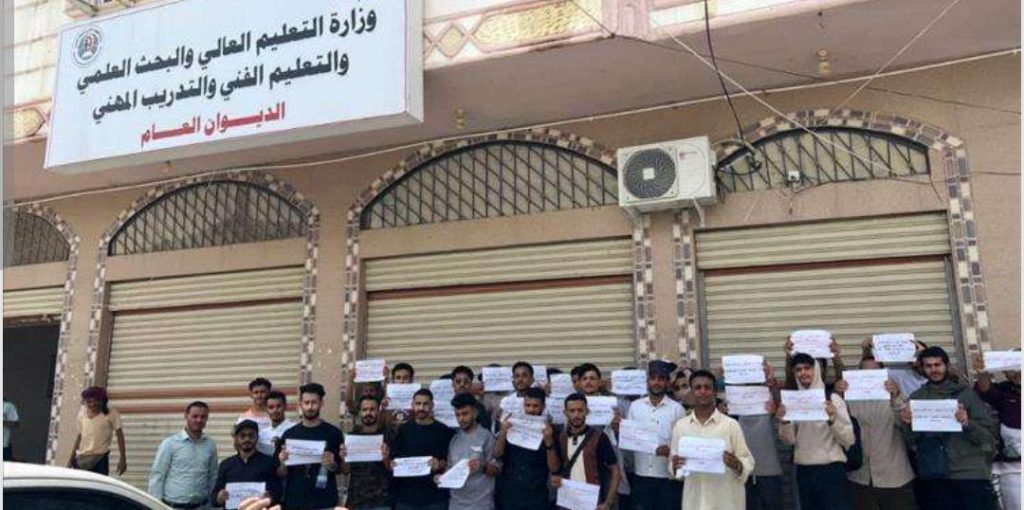 طلاب الجامعات الخاصة ينظمون وقفة احتجاجية أمام وزارة التعليم العالي بعدن رفضًا لرفع الرسوم