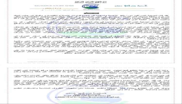 واختتمت الجمعية بيانها بدعوة جميع الأطراف إلى تحمل مسؤولياتهم في هذه المرحلة الحساسة، والعمل بشكل جماعي للحفاظ على استقرار الاقتصاد والعملة الوطنية.