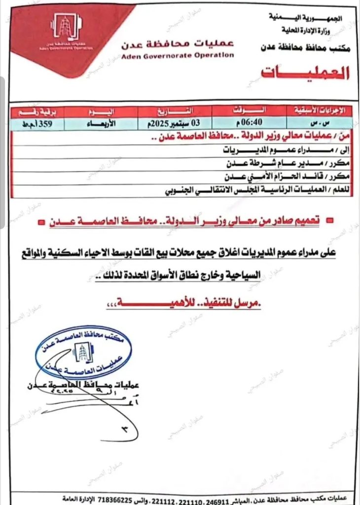 أصدر محافظ العاصمة عدن، أحمد لملس، توجيهات إلى مدراء عموم المديريات تقضي بإغلاق جميع محلات بيع القات المنتشرة وسط الأحياء السكنية والمواقع السياحية، وحصر نشاطها فقط داخل نطاق الأسواق المخصصة لذلك.
