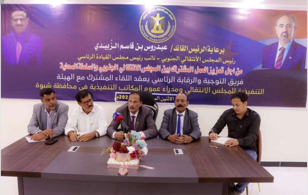 عقد فريق التوجيه والرقابة الرئاسي برئاسة عضو هيئة رئاسة المجلس الانتقالي الجنوبي، الدكتور سالم علي القميري، اليوم الاثنين، لقاءً مع عددٍ من مدراء عموم مكاتب السلطة المحلية بمحافظة شبوة.
