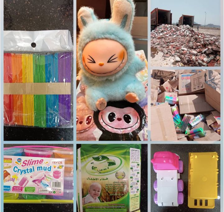 ورفض 3 كرتون باكيتات فارغة للتغليف ، (مواد أولية)، معدة لتغليف منتجات اغذية اطفال، مخالفة للمواصفات لوجود صورة طفل على المنتج، وهذا يخالف المواصفات القياسية الخاصة بعبوات تغليف اغذية الاطفال، ورفض 28 كيس سكر أبيض لتعفن المنتج نتيجة تعرضه للبلل، وكمية من عجينة الاسلايم كون المادة خطيرة وتعد سامة للاطفال.