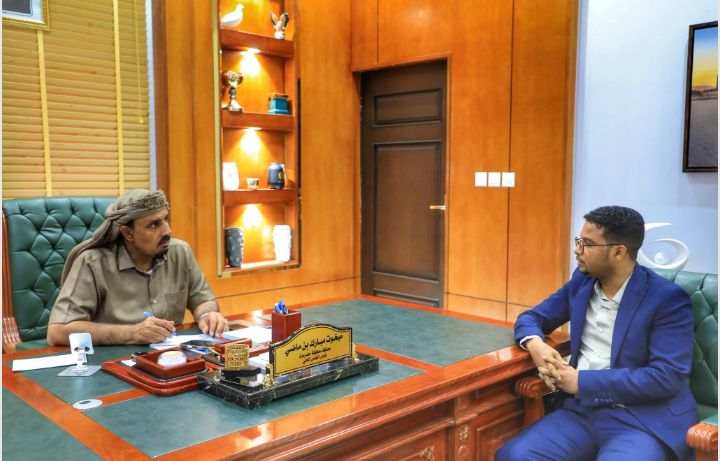 ​التقى محافظ حضرموت الأستاذ مبخوت مبارك بن ماضي، اليوم بالمكلا، مدير عام مكتب وزارة الشباب والرياضة بالوادي والصحراء الدكتور مجدي سليمان مطران بن طليب، للاطلاع على أوضاع قطاع الشباب والرياضة وسير الأنشطة والبطولات الرياضية في الوادي.