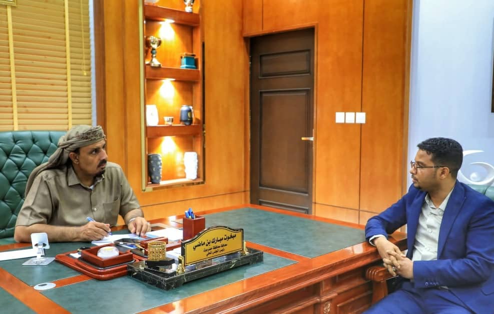 اطلع محافظ حضرموت، الأستاذ مبخوت مبارك بن ماضي، اليوم بالمكلا، على سير الأنشطة الشبابية والرياضية في وادي حضرموت، خلال لقائه مدير عام مكتب وزارة الشباب والرياضة بالوادي والصحراء، الدكتور مجدي سليمان مطران بن طليب.