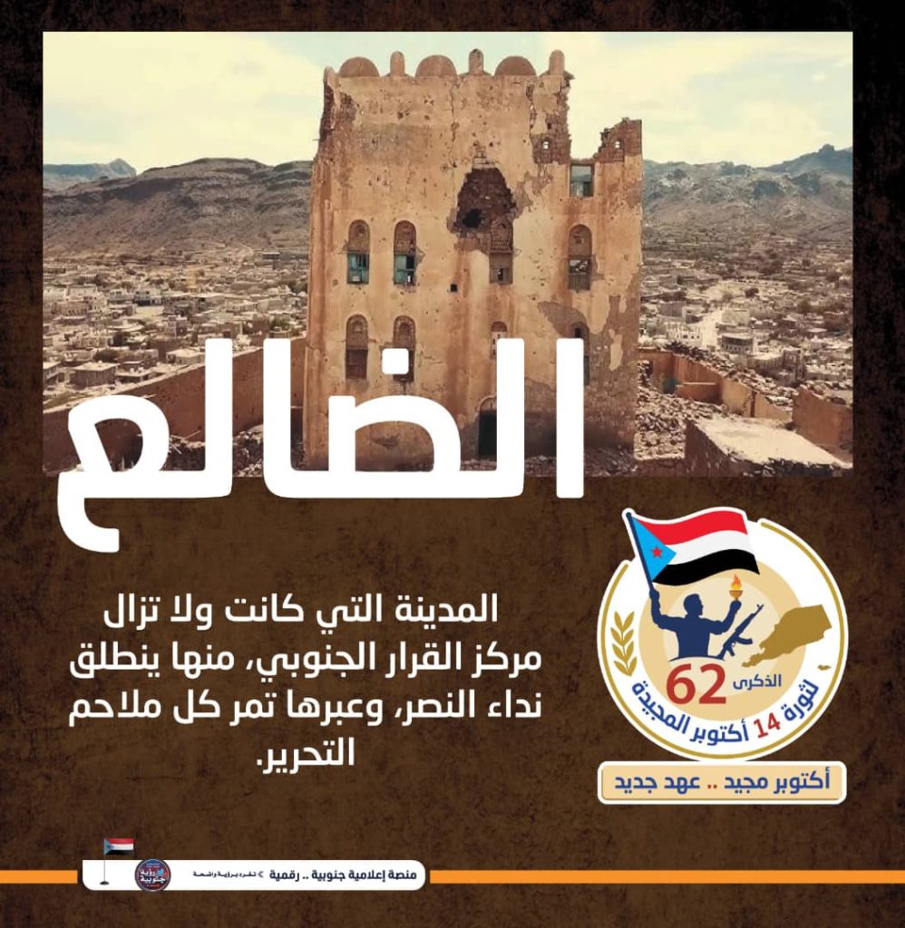 تشهد محافظة الضالع لقاءات مكثفة واستعدادات استثنائية على المستويين الرسمي والشعبي، لإحياء الذكرى الثانية والستين لثورة الرابع عشر من أكتوبر المجيدة، الثورة التي أعادت للشعب الجنوبي كرامته وسيادته، ورسّخت مبادئ الحرية والنضال الوطني في وجه الاستعمار والطغيان.