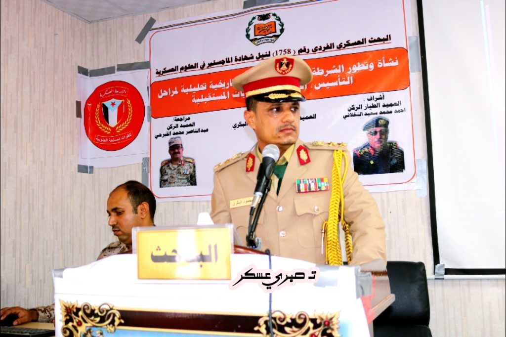 أجمل التهاني والتبريكات نبعثها للأخ العميد أحمد محمود البكري قائد لواء الشرطة العسكرية الجنوبية بمناسبة حصولـه على درجة الماجستير في العلوم العسكرية من كلية القيادة والأركان عدن في رسالته البحثية بعنوان ” نشأة وتطور الشرطة العسكرية .. دراسة تاريخية تحليلية لمراحل التأسيس والأدوار والتحديات المستقبلية ” بحضور عدد كبير من القادة العسكريين والأكاديميين والشخصيات الوطنية .