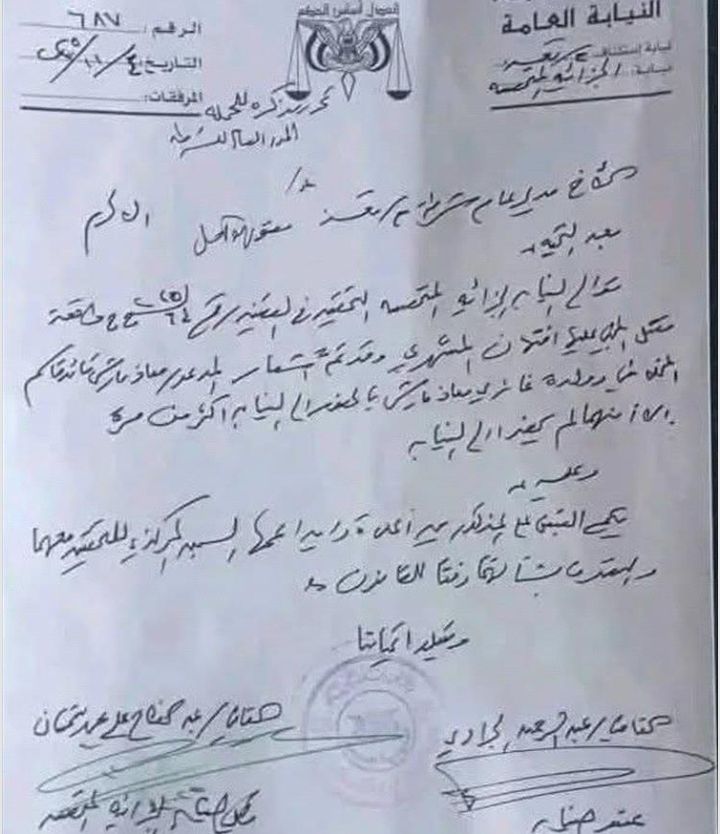 وطبقاً لوثيقة رسمية، فقد وجّهت النيابة، برئاسة القاضي عبدالفتاح علي شمسان وعضوية القاضي عبدالرحمن الجرادي، مذكرة إلى مدير أمن المحافظة تقضي بإلقاء القبض على المذكورين وإيداعهما السجن المركزي، بعد تمردهما على أوامر الاستدعاء المتكررة للتحقيق في القضية.