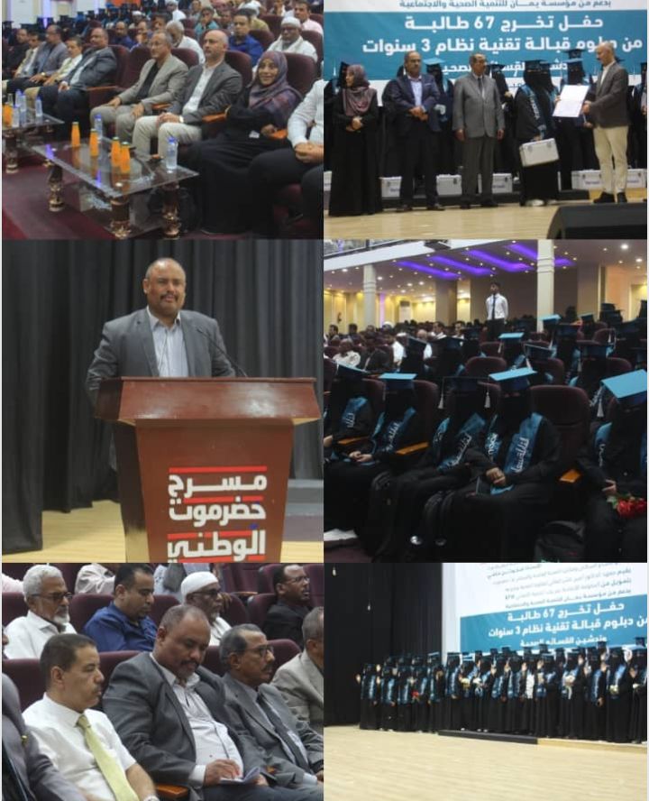 برعاية كريمة من الدكتور قاسم محمد بحيبح، معالي وزير الصحة العامة والسكان، والأستاذ مبخوت مبارك بن ماضي، محافظ محافظة حضرموت، وبالتعاون مع قطاع السكان، ومكتب وزارة الصحة العامة والسكان بساحل حضرموت، شهدت المسرح الوطني بمدينة المكلا اليوم فعالية حفل تخرج 67 طالبة من دبلوم قبالة تقنية نظام ثلاث سنوات بمعهد الدكتور أمين ناشر للعلوم الصحية وفروعه، وتدشين لبرنامج القسائم الصحية.