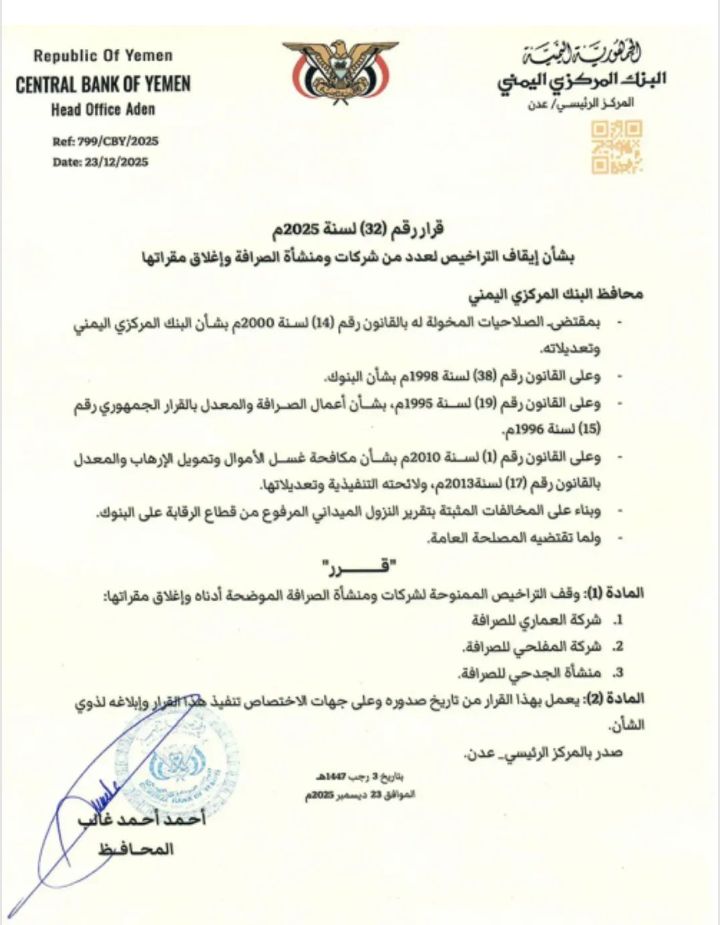أصدر محافظ البنك المركزي اليمني، الأستاذ أحمد أحمد غالب، اليوم الثلاثاء، قراراً برقم (32) لسنة 2025، قضى بإيقاف التراخيص الممنوحة لثلاث من شركات ومنشآت الصرافة في العاصمة عدن وإغلاق مقراتها بشكل فوري.