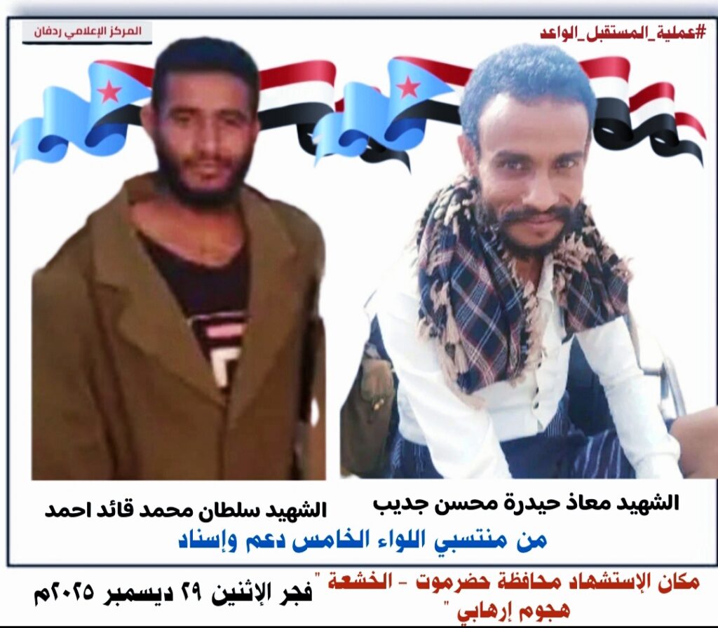 وعبّرت قيادة اللواء الخامس دعم وإسناد عن بالغ حزنها وألمها لإستشهاد أثنين من منتسبيها وهما الشهيد البطل “ سلطان محمد قائد احمد ” والشهيد البطل “معاذ حيدرة محسن جديب ” في وادي حضرموت – الخشعة وهما يؤديان الواجب الوطني ضمن عملية المستقبل الواعد “