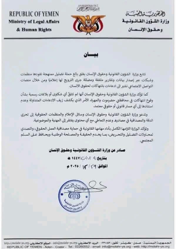 كشف هذه الشبكة المسماة الشبكة اليمنية للحقوق والحريات لهذا الغرض بيان من وزارة الشؤون القانونية وحقوق الانسان صدر اليوم، مؤكداً عدم وصول اي بلاغات عن انتهاكات من اي مواطن في حضرموت، مستغرباً عن عمليات ترويج لتقارير مضللة تصدر عن مؤسسات مشبوهة تدعي حدوث انتهاكات هناك، محذراً التعاطي مع اي بيانات او تقارير تصدر عن مؤسسات او منظمات مشبوهة..