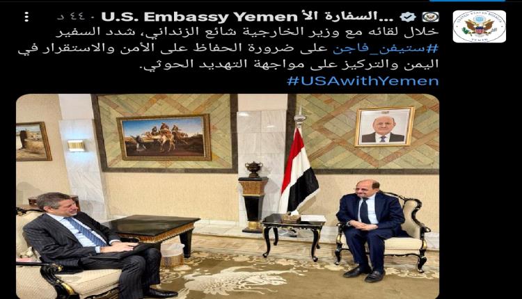 إلى أن التوضيح الأكثر حسما أتى من خلال ما نشره حساب السفارة الأمريكية على منصة X عقب لقاء العليمي، وقالت السفارة : خلال لقائه مع الرئيس العليمي، ناقش السفير ‎ستيفن فاجن أهمية اليمن للأمن الإقليمي، إضافةً إلى تعزيز التعاون الثنائي في مواجهة الحوثيين وسائر التهديدات الإرهابية، بما في ذلك تنظيم القاعدة وداعش.