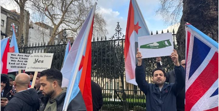 نظّم أبناء الجنوب المقيمون في المملكة المتحدة، اليوم، وقفة احتجاجية سلمية أمام مقر سفارة المملكة العربية السعودية في العاصمة البريطانية لندن، تعبيراً عن إدانتهم الشديدة للتصعيد العسكري والانتهاكات الجسيمة التي تستهدف الجنوب وقصف الطيران الذي طال محافظات حضرموت والمهرة والضالع، وسط مطالبات بتدخل دولي لحماية المدنيين. ورفع المشاركون في الوقفة شعارات نددت بقصف الأحياء المدنية، معتبرين أن هذه الأعمال تمثل انتهاكاً صارخاً للقانون الدولي الإنساني، معبرين في بيان صادر عن الوقفة عن قلقهم البالغ من توجهات تشمل عسكرة المدن الجنوبية وإقحام مجاميع متطرفة تهدف إلى ضرب الاستقرار المجتمعي وترهيب السكان الآمنين. وفي الشأن السياسي، أعلن أبناء الجنوب في بريطانيا رفضهم محاولات تفكيك المجلس الانتقالي أو تهميش دوره سياسيا، محذرين من وجود مؤشرات تعكس انحيازاً لرفد أجندات طرف شمالي، مؤكدين أن هذه التحركات تعيد إنتاج سيناريو حرب صيف 1994، وتهيئ المناخ لغزو جديد للجنوب تحت غطاء ترتيبات سياسية مشبوهة. واستنكر البيان بشدة حملات الشيطنة والتحريض الإعلامي الممنهج ضد الرئيس القائد عيدروس الزُبيدي، واستهداف شخصه بالشائعات وحملات التشويه