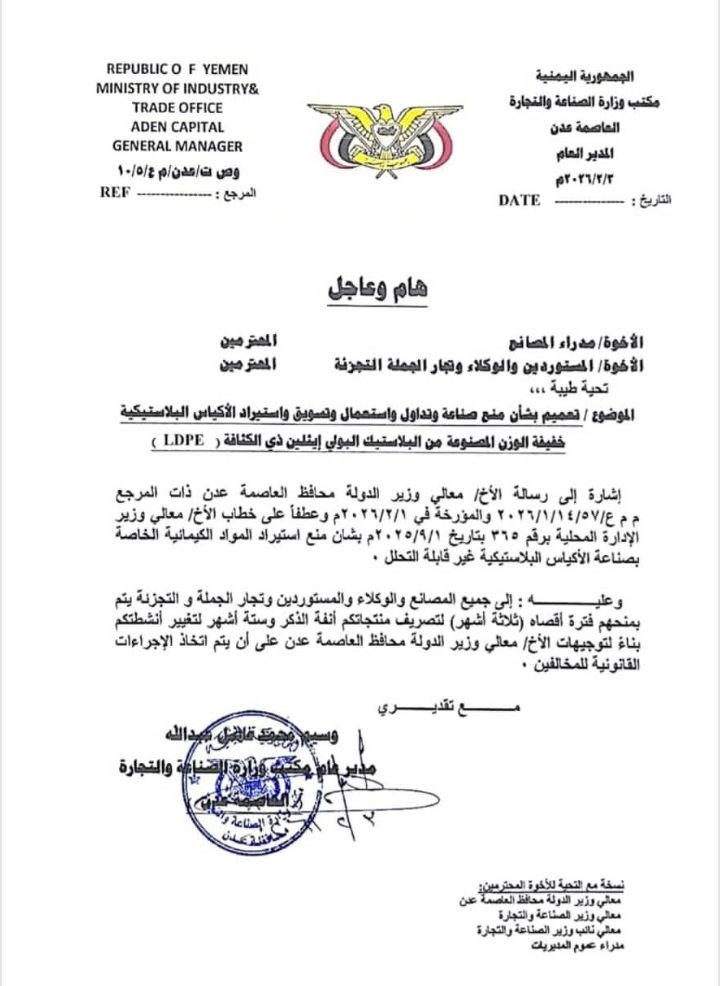 أصدر مكتب الصناعة والتجارة في العاصمة عدن تعميماً “هاماً وعاجلاً” يقضي بحظر صناعة وتداول واستيراد أكياس البلاستيك خفيفة الوزن (LDPE) غير القابلة للتحلل، وذلك في إطار جهود السلطات المحلية لصون النظام البيئي والحد من التلوث الكيميائي. وجاء في نص تعميم مدير عام مكتب الصناعة والتجارة بعدن العميد وسيم العُمري، أن هذا الإجراء يأتي استناداً إلى جملة من التوجيهات الصادرة عن معالي وزير الدولة محافظ العاصمة عدن عبدالرحمن شيخ ووزارة الإدارة المحلية، والتي منعت بموجبها استيراد المواد الكيميائية الداخلة في صناعة مثل هذه الأكياس غير القابلة للتحل.