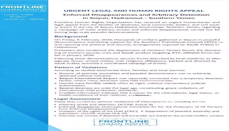 قدّمت منظمة فرونت لاين البريطانية لحقوق الإنسان من مقرها بلندن نداءً قانونيًا وحقوقيًا عاجلًا بشأن انتهاكات جسيمة شهدتها مدينة سيئون بمحافظة حضرموت، جنوب اليمن، عقب تظاهرات سلمية واسعة خرج فيها عشرات آلاف المواطنين دعمًا للمجلس الانتقالي الجنوبي ورفضًا للترتيبات السياسية والأمنية المفروضة من قبل المملكة العربية السعودية.