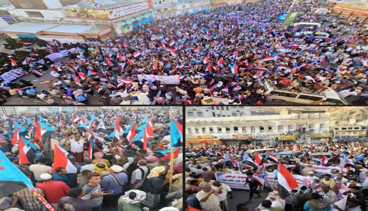 ورفع المحتجون أعلام الجنوب وصور رئيس المجلس الانتقالي الجنوبي عيدروس الزبيدي ونائبه اللواء فرج البحسني كتفويض شعبي جديد للمجلس وقياداته لتمثيل القضية الجنوبية.