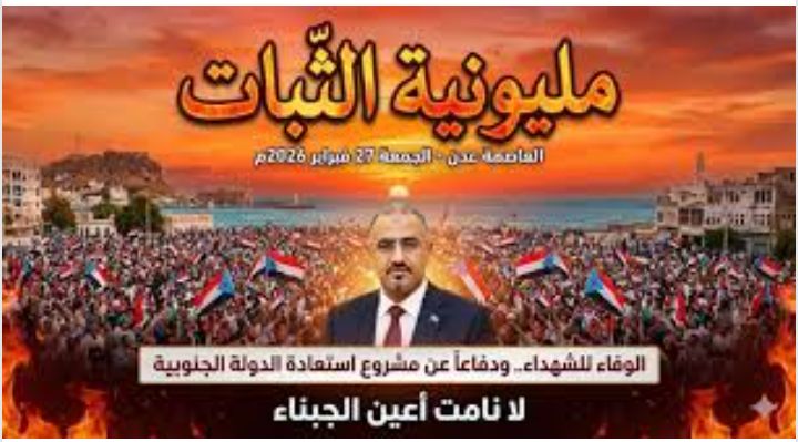 وامام كل ذلك واستجابة ومشاركة لانجاح مليونية الثبات والقرار ودعماً وتأييدا لدعوة المجلس الانتقالي فإن رئاسة الهيئة العسكرية العليا للجيش والأمن الجنوبي تدعو كافة قيادات ومنتسبي فروع الهيئة في المحافظات والمديريات للاحتشاد في ساحة العروض خور مكسر في العاصمة عدن غداً الجمعه الموافق  27 فبراير ٢٠٢٦م العاشره مساء للتأكيد مجددا على وقوفنا مع شعبنا الجنوبي المكافح لاستعادة كرامته وسيادته على كامل جغرافية الجنوب العربي.