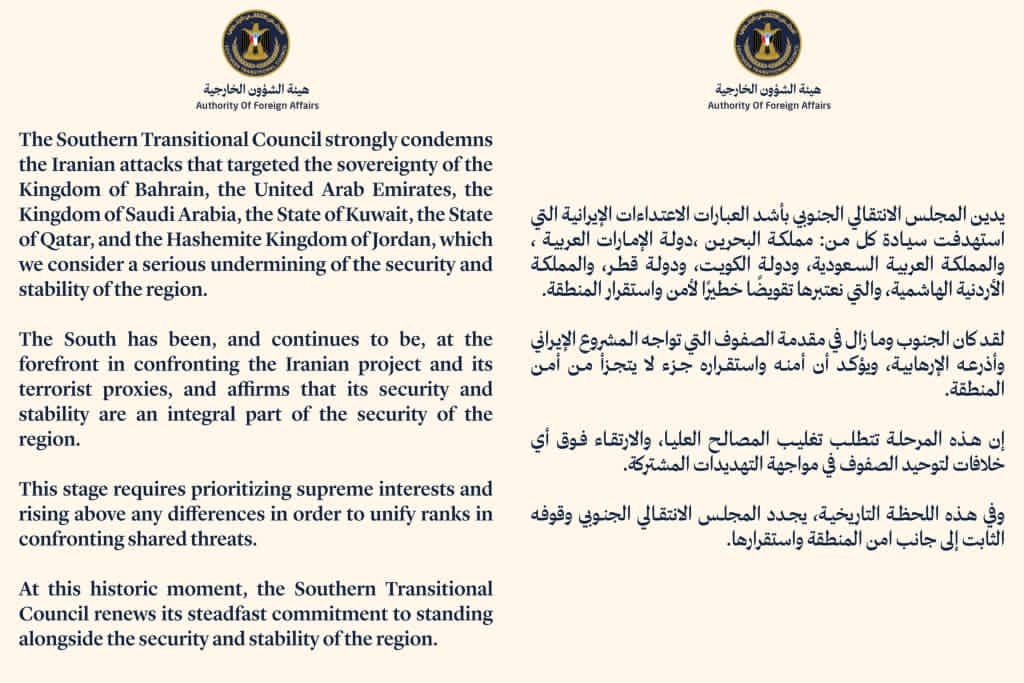 المجلس الانتقالي الجنوبي: ندين الاعتداءات الإيرانية التي استهدفت البحرين والإمارات والسعودية والكويت وقطر والأردن