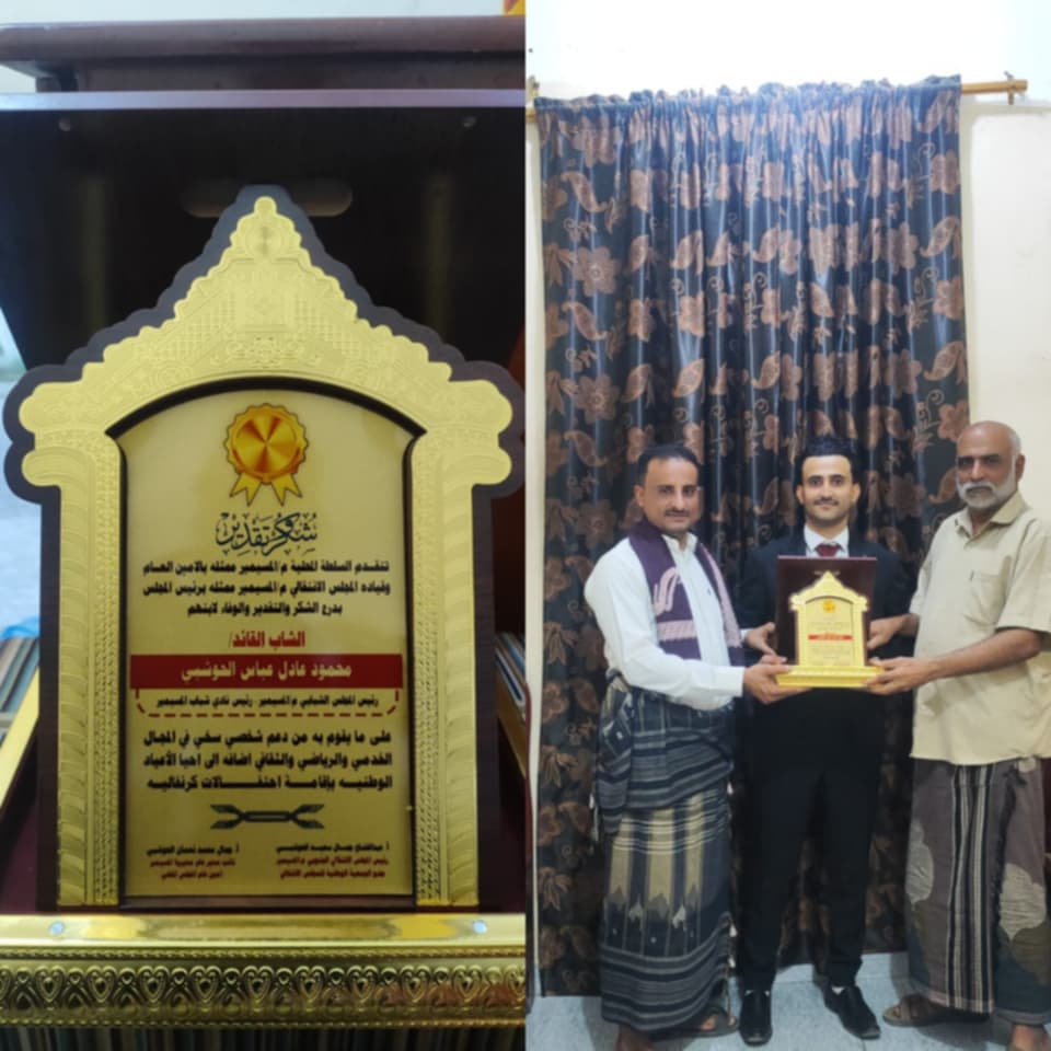 مديرية المسيمير تكرم القائد محمود عادل الحوشبي رئيس نادي شباب المسيمير ورئيس المجلس الشبابي