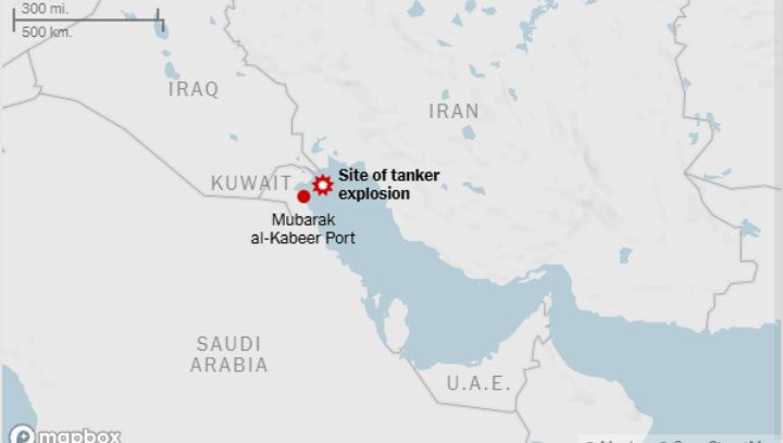 ذكرت هيئة عمليات التجارة البحرية البريطانية، مساء الاربعاء، انها تلقت بلاغا من قبطان ناقلة كانت راسية على بُعد نحو 30 ميلاً بحرياً جنوب شرقي الكويت يفيد شاهد وسمع انفجاراً كبيراً عند جانب الميناء، أي الجهة اليسرى من السفينة، قبل أن يلاحظ زورقاً صغيراً يغادر المنطقة.