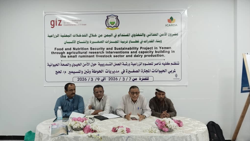 نظمت كلية ناصر للعلوم الزراعية بمحافظة لحج ورشة عمل تدريبية تحت إشراف منظمة ICARDA ايكاردا و بتمويل من البرنامج الالماني giz حول الأمن الحيوي والصحة الحيوانية لمربي الحيوانات المجترة الصغيرة في مديريات الحوطة وتبن والمسيمير، وذلك خلال الفترة من 7 إلى 9 مارس 2026.