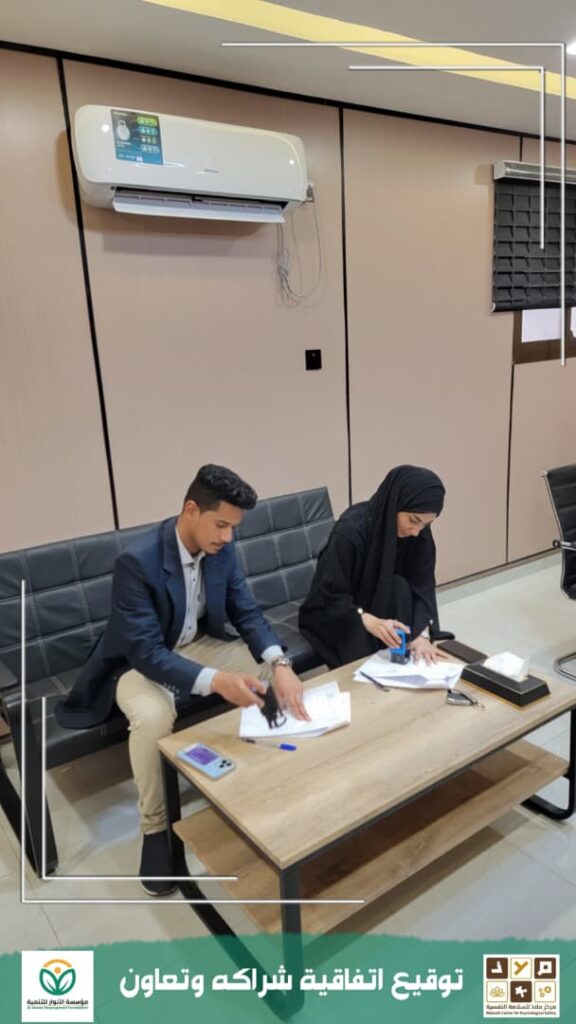 ومثّل الجانبين في مراسم التوقيع كلٌ من الأستاذ عمر ملهم، رئيس مؤسسة الأنوار للتنمية، والدكتورة ياسمين نبيل، رئيس مركز ملاذ للصحة النفسية.