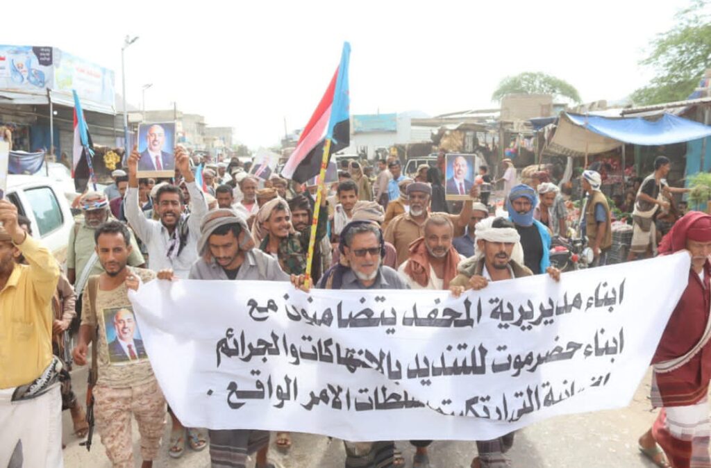 وطاف المتظاهرين الشارع العام للمدينة، حاملين إعلام دولة الجنوب العربي، وصور الرئيس الزٌبيدي، ولافتات تٌعبّر عن تضامنهم المطلق لجانب أخوانهم أبناء حضرموت،ومرددين هتافات وشعارات غاضبة تندد بما أقدمت عليه قوات الإحتلال اليمني وسلطات الأمر الواقع المدعومة سعودياً بإطلاقها الرصاص الحي على المتظاهرين السلميين