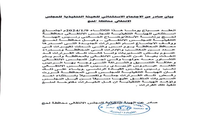 أعلنت الهيئة التنفيذية للقيادة المحلية للمجلس الانتقالي الجنوبي بمحافظة لحج رفضها القاطع والمطلق للقرارات التي أصدرها محافظ المحافظة اللواء أحمد عبدالله التركي يوم أمس والتي شملت تغييرات في عدد من المكاتب والادارات في المحافظة ومدراء عموم بعض المديريات .